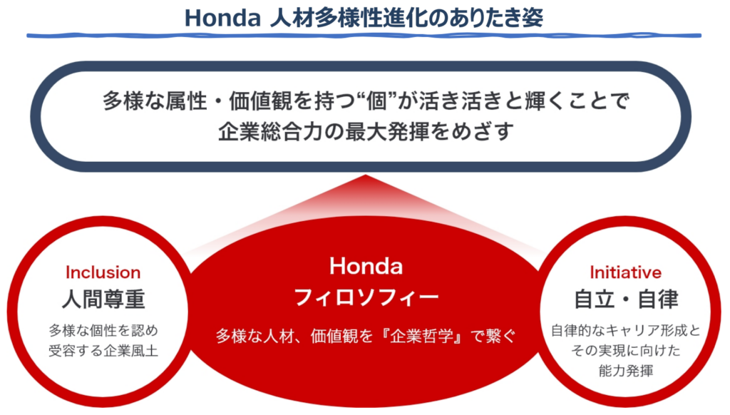Hondaは、フィロソフィーである「人間尊重」に基づき、人種・国籍・文化・年齢・性別・性自認・性的指向・性表現・経歴・教育・障がいの有無などの属性に関わらず等しく機会を有し、異なる個性・持ち味を尊重し合い、個を存分に発揮することで企業としての総合力を高めることを目指しています。個々の違いをぶつけ合うコミュニケーションから真の信頼関係や新しい発想が生まれ、イノベーションへとつながっていきます。そのため