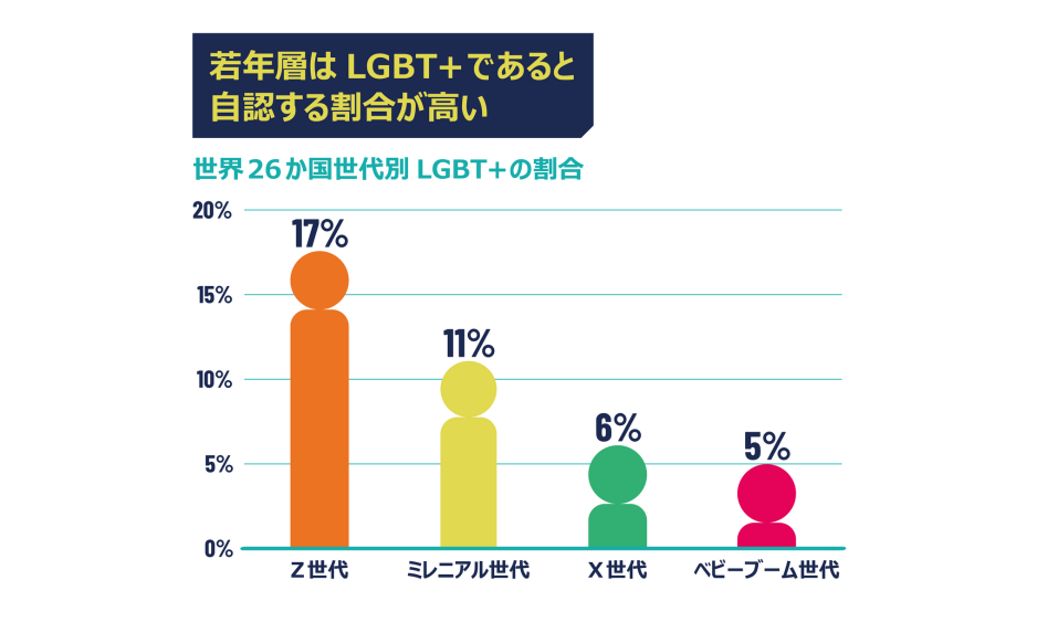 日本でも同様の傾向が見られ、若い世代ほどLGBT+を自認する割合が高くなっています。若い世代は、LGBT+に対する社会の理解や受容が進んだ時代に育ち、カミングアウトしやすい環境にあることが要因の一つと考えられます。