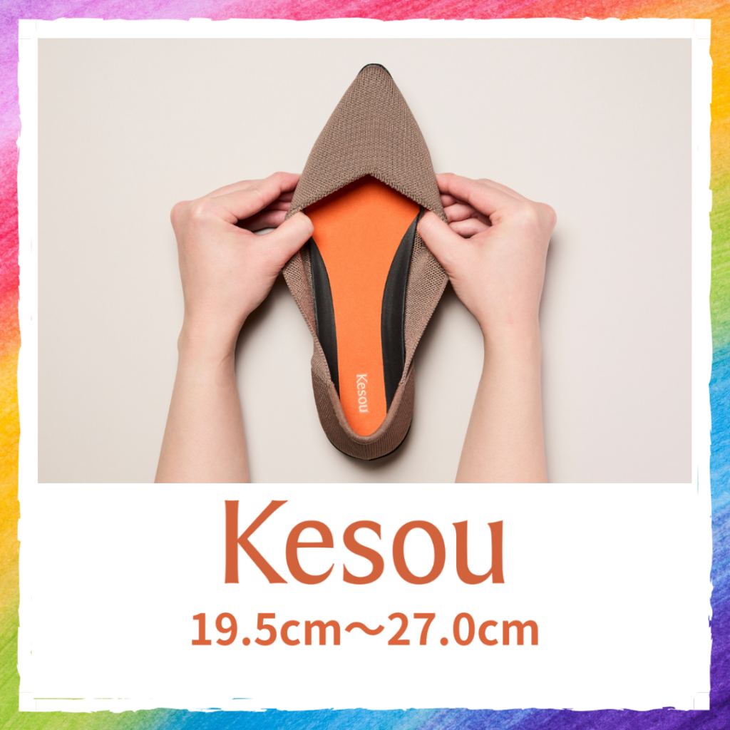 Kesouという名前は、想いをかけることを意味する古語「懸想(けそう)」から生まれました。ペットボトルから再生された糸で作られたニットは、まるで、くつ下のような履き心地。環境にも優しいパンプスです。