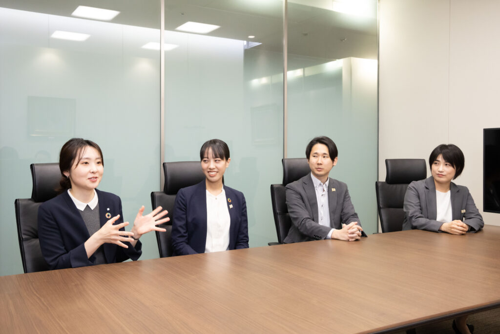 キャプション:左から三井住友信託銀行 人事部 DE&I推進室 太田千裕さん、三井住友信託銀行 町田支店・相模大野支店 金子美桜さん、三井住友信託銀行 渋谷・渋谷中央支店 内藤茉優さん、三井住友トラスト不動産投資顧問 投資部 山下麻里さん(※各所属は取材時点のもの)
