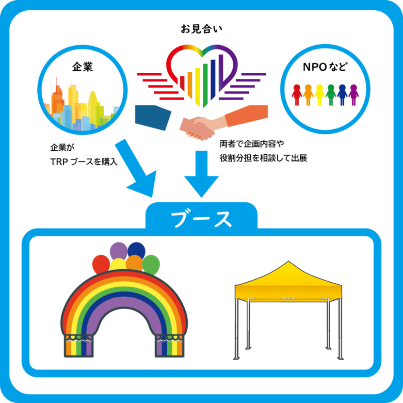 本企画は、Tokyo Pride 2025 Parade & festivalにおいて、企業とNPO・非営利当事者団体がブース出展において協働して企画・運営。その際のブース出展費用を、企業側が負担するものです。