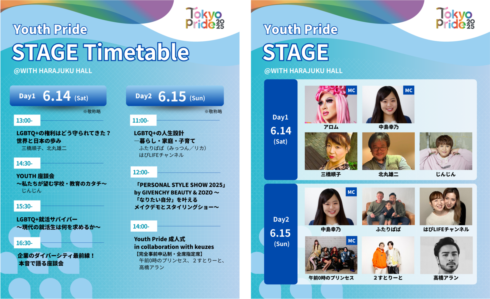 Tokyo Pride 2025で初開催されるYouth世代向けのプライドイベント「Youth Pride(ユースプライド)」のステージプログラムに、じんじんさんと高橋アランさんの出演者が決定しました!